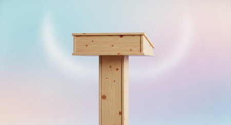 Post showing wooden lectern with slanted and vertical post against a softly blurred pastel background. resolution