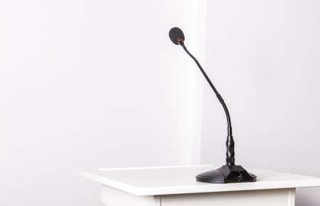 Podium with a microphone on stage illuminated by spotlights. 3D rendering