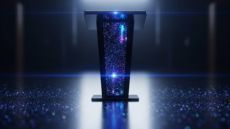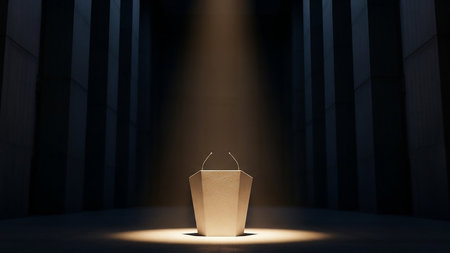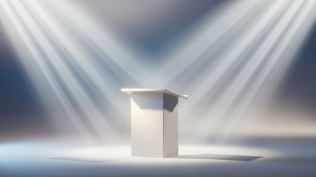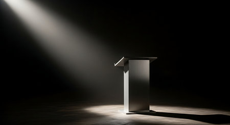 An empty, modern podium stands alone in a dark, cavernous space, dramatically illuminated by a single, warm spotlight from above.