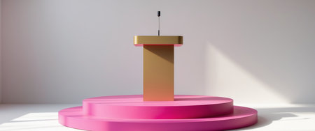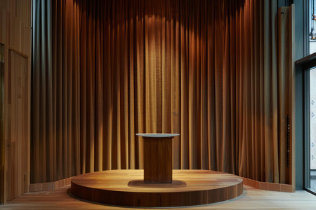 Contemporary podium stands on a round platform in a room with luxurious brown curtains, showcasing sleek design