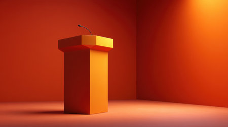 A bright orange podium stands in a minimalist, empty room, designed for presentations or speeches. This vibrant setup emphasizes communication and engagement.