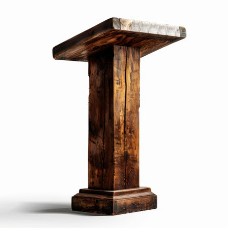 This rustic wooden podium stands tall with a rich, warm texture, ideal for presentations, speeches, or as an elegant decorative piece in any environment.