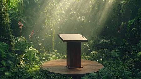 A serene wooden podium stands in the heart of a lush forest, bathed in soft sunlight, surrounded by vibrant greenery, creating a tranquil setting for presentations or gatherings.