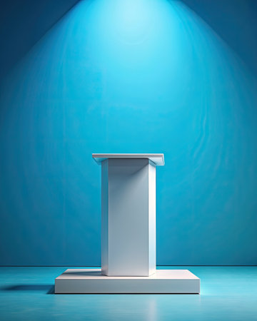 A dark, empty podium stands on a stage, bathed in the dramatic glow of a single, bright blue spotlight from above, casting long shadows.