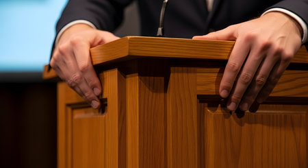 A close-up of a man in a suit with his hands resting firmly on the corners of a wooden podium or lectern. This image captures a moment during a public speech, presentation, or political debate, conveying authority and confidence.