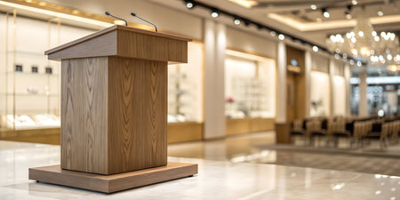 A modern wooden podium with two microphones stands on a marble surface. The background is a blurred upscale retail space, featuring display cases and seating. The atmosphere is professional and calm. The background is not transparent, possibly a slight blur effect.