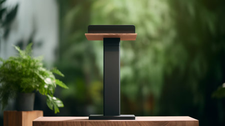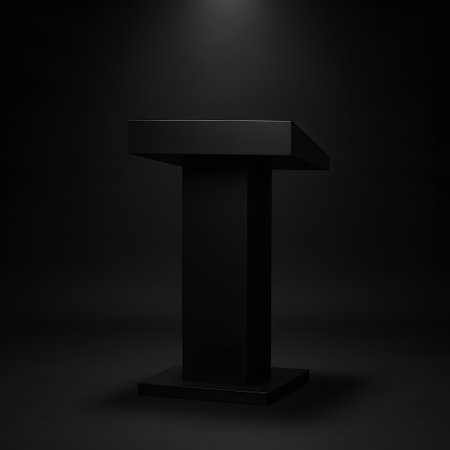 Modern black podium set against a dark backdrop. Perfect for presentations, public speaking, and formal events with a sleek design.