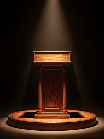 A dark wooden podium with classical details is dramatically lit by a single spotlight from above against a black background.