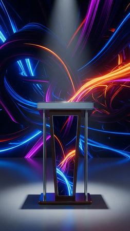 A sleek, modern podium stands in a dark room against a dynamic, abstract background of swirling blue, pink, and orange neon lights.