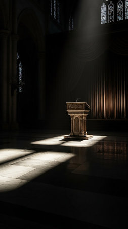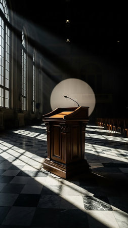 A wooden lectern with a microphone stands in a grand, dimly lit hall, illuminated by dramatic shafts of sunlight streaming through large arched windows.