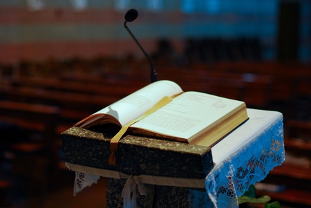 A male in a formal outfit preaching the Holy Bible from the tribune at the altar of the church