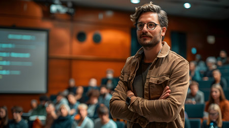Man giving presentation in lecture hall at university.
