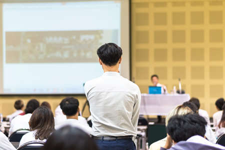 Seminar Q&A session with a participant rear view standing among audience group participating in asking question to speaker for answer in entrepreneur business conference or education lecture hall