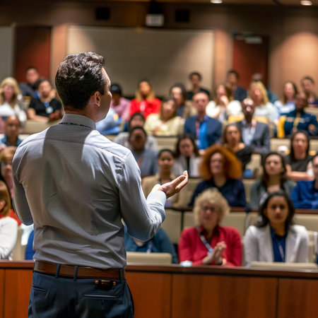Young businessman giving a motivational speech during a conference in a modern auditorium, inspiring the audience with his engaging presentation
