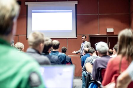 young successful businessman at business conference room with public giving presentations. Audience at the conference hall. Entrepreneurship club