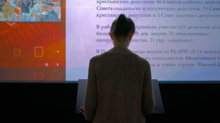 MOSCOW, RUSSIA - August 29, 2018: Modern Museum of Russia History. Woman using interactive touchscreen display