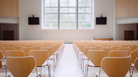A captivating view of an empty auditorium featuring rows of wooden chairs and large, elegant windows, creating a serene and tranquil atmosphere.