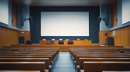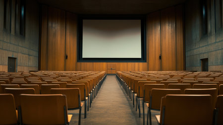 Rows of empty chairs facing a large screen in a seminar hall, natural lighting and minimalist design