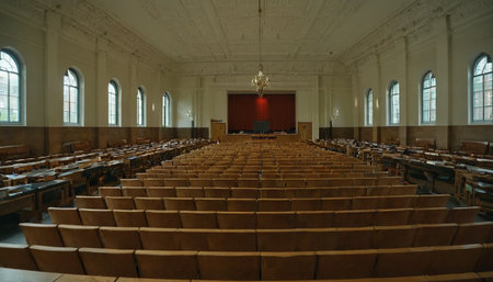 A cinematic wide shot capturing the scale of an empty, traditional university lecture hall. A large