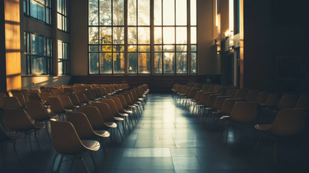 Rows of empty chairs fill the spacious hall, bathed in warm light from large windows as the sun sets, creating a serene and inviting atmosphere.