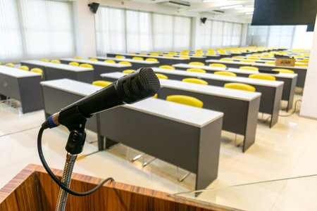 A modern educational classroom featuring an empty layout with rows of seats and a microphone setup, ideal for presentations and teaching activities.