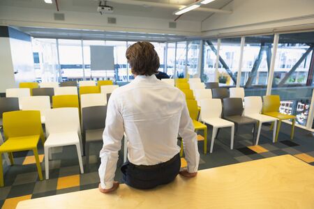 Rear view of handsome young Caucasian businessman sitting on a table in the conference room at office
