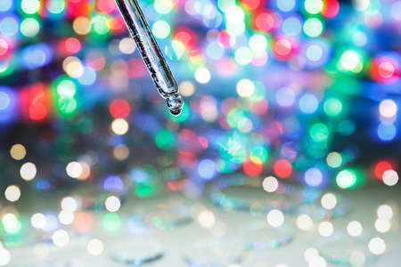 Transparent serum pipette with drops on dark background with colored light blurred and bokeh. Cosmetics greeting concept. Minimalism style and extreme close up.