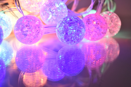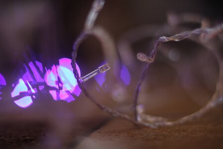 A colorful background with glowing Christmas garland. Macro shot. Selective focus.