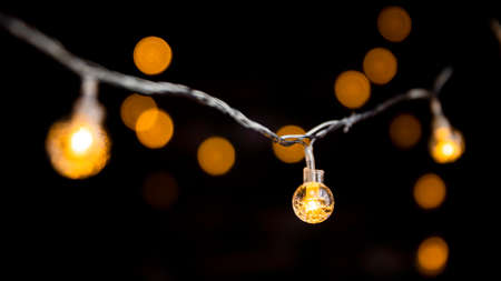 Background - electric garland with incandescent bulbs, yellow warm light, retro style, star filter, atmospheric close-up