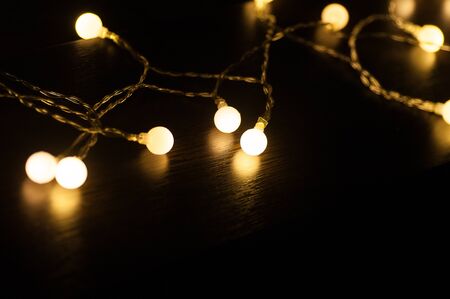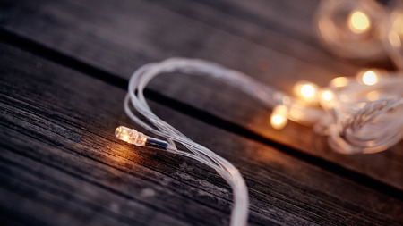 Christmas garland lights on wooden rustic background.Selective focus.Winter holidays concept.