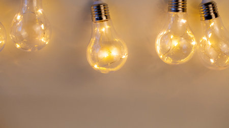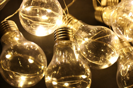 Glowing yellow light bulbs, realistic photo depiction of turning on a tungsten light bulb. Edison lamps in the interior. A garland of light bulbs.Copy space