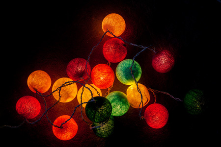 Lamp closeup and little white lights on a garland lying on the floor, blur