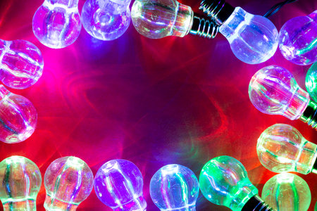 Close-up of wires with multicolored LED bulbs on a red-black background. selective focus.