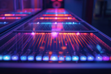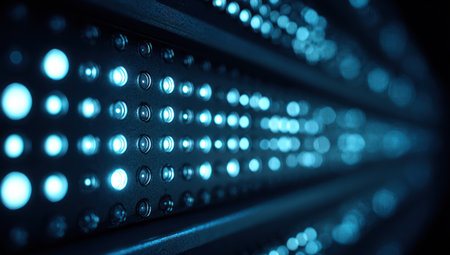 An array of blue lights illuminates a dark background, creating a visual display of data flow. The composition uses a shallow depth of field, with the lights in focus. This image features a modern, clean aesthetic and is suitable for technology, science, or conceptual illustrations.