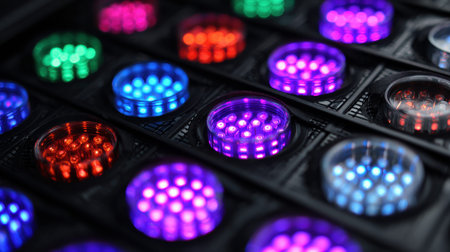 This close-up image features an array of vibrant illuminated buttons on a control panel, showcasing a modern technological design against a dark background.