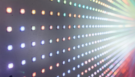 Close-up view captures LED pixels used in a stage light fixture, showing various colors and the details of lighting technology in use