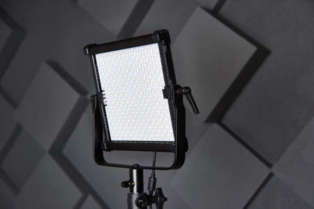 studio assistant fix professional video light on adjustable light stand. Led lamp on tripod in photo studio. Photo and video lamp on embossed grey wall background. Close-up view
