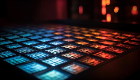 Explore a vibrant abstract circuit board background featuring colorful LED lights. This digital art design symbolizes innovation, technology, and connectivity in a modern aesthetic.