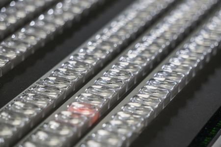 Video Mixer Switcher. Broadcasting studio, professional mixing sender with color buttons. Professional digital video mixer with many buttons and settings. Control panel video channels, close-up.