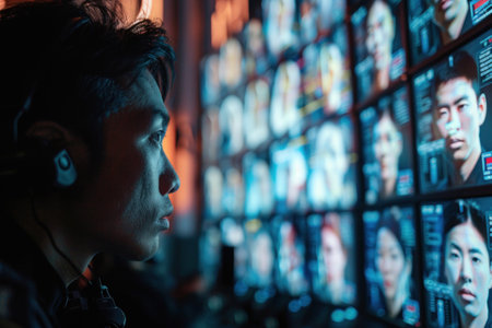 Person in a headset monitoring multiple screens in a surveillance room. Advanced cyber security measures and face recognition technology in use.