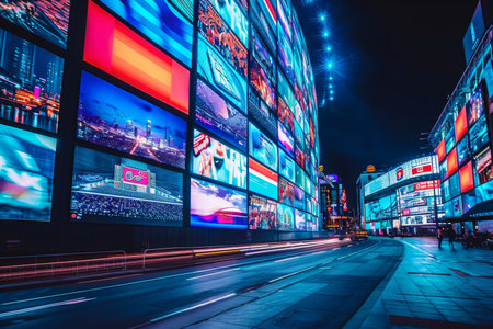 Engaging urban video wall showcasing varied visual content in a dynamic city environment