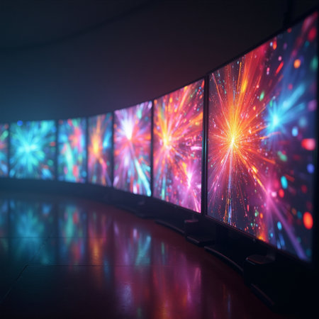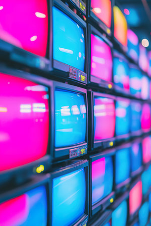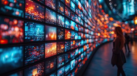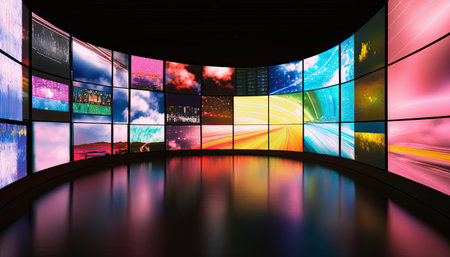 Vibrant futuristic wall of digital screens showcasing colorful scenes in a modern media control room