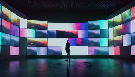 Modern art gallery showcasing a collection of colorful digital artwork on a large video wall, creating an immersive visual experience