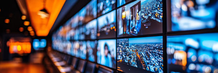 Diverse media displays on a wall with blurred dark background and professional camera focus