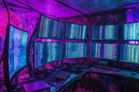 A cyberpunk hacker’s hideout 3D background room with multiple curved monitors displaying scrolling code, neon graffiti-covered walls, and wires running across the floor. The dim purple and blue lighting adds to the underground, rebellious digital aesthetic.