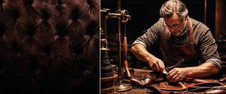 Shoemaker working with leather creating luxury handmade shoes with copy space banner