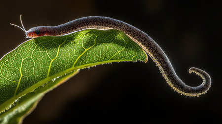 This captivating close-up captures a colorful caterpillar resting on a green leaf, showcasing intricate details and textures in sunlight, embodying nature's beauty.