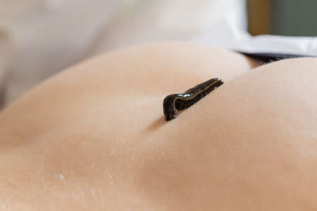 Medical leech on the human body drink blood. Treatment with leeches. Macro video.