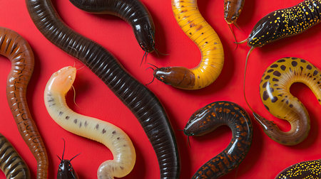 A vivid array of plastic eel toys features dynamic colors and patterns, set against a striking red background ideal for capturing playful creativity.