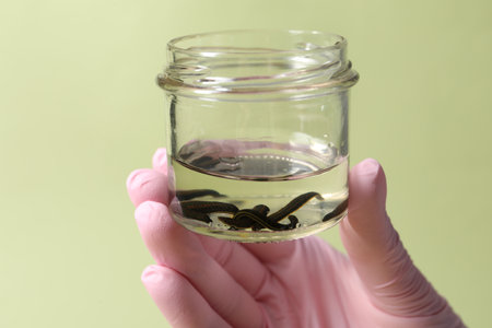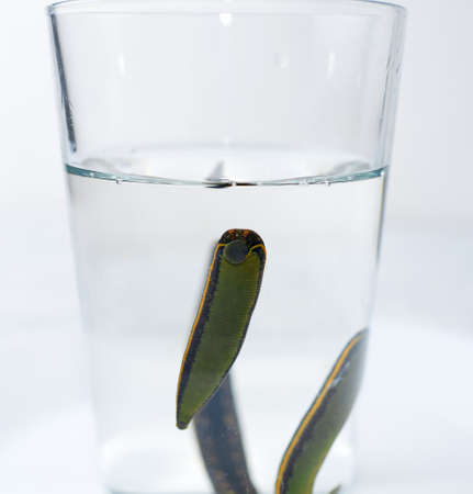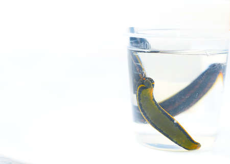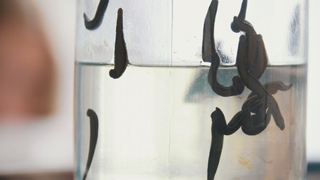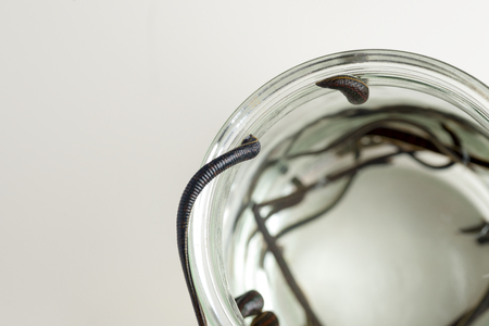 Bank with leeches - hirudotherapy, medical leeches in a glass in water
